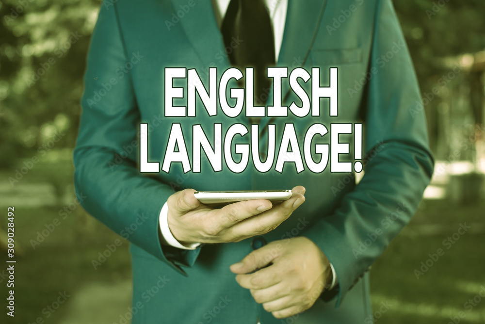 Conceptual Hand Writing Showing English Language Concept Meaning Third Spoken Native Lang In World After Chinese And Spanish Businessman In Blue Suite Stands With Mobile Phone In Hands Stock Photo Adobe